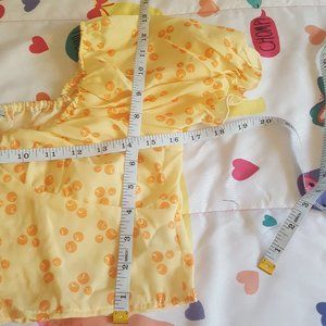 yellow orange bubble print ruched sweetheart neck short puff sleeve crop top