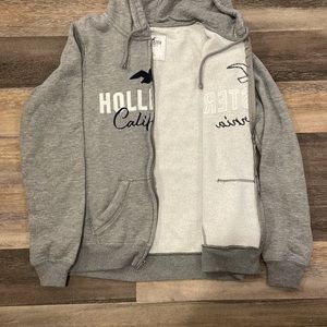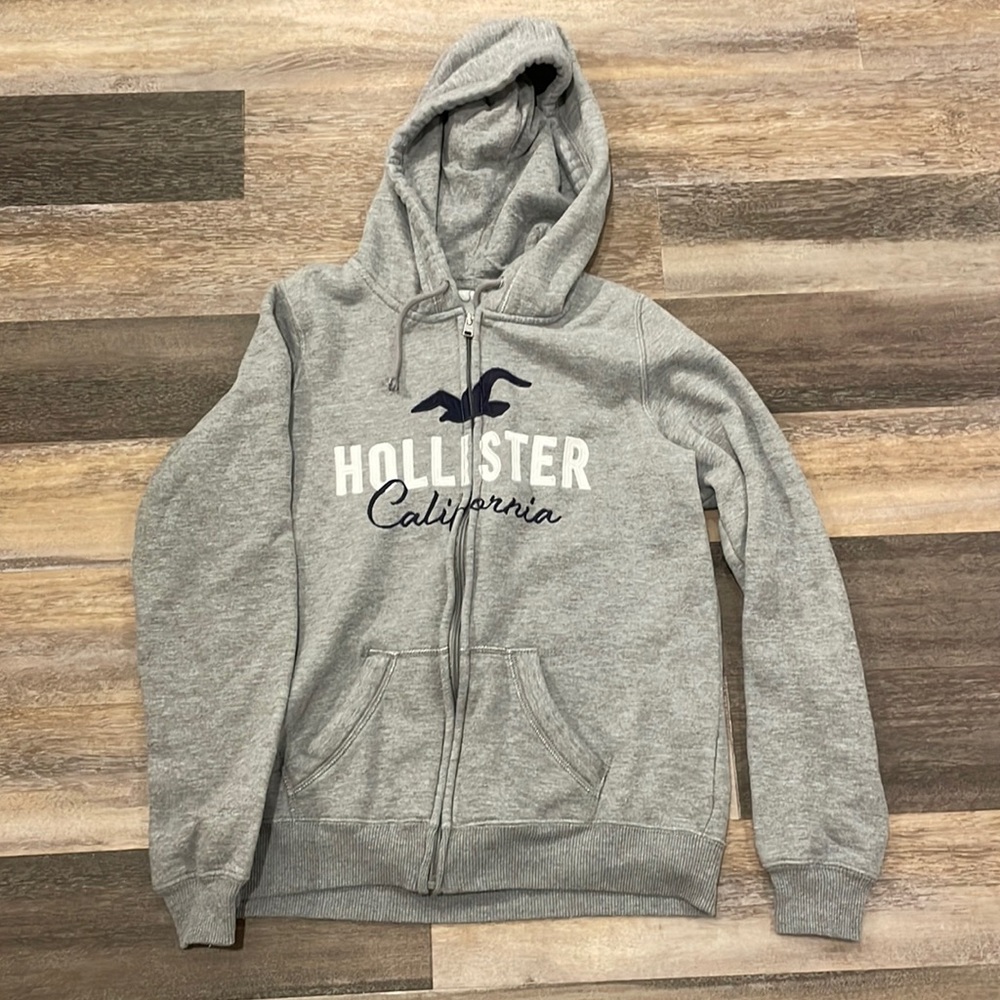 gray zip up with “hollister california” logo on front