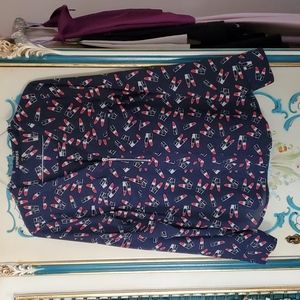 I am selling my long sleeved Express zip up lipstick Portofino shirt- size small. it's just sitting in my closet and it deserves to be worn. It is like new. I only wore it once. Super sexy. Adjust the zipper to where you want. The color is navy. Lipsticks are red. It also has two pockets in the front. Very soft and silky. Sleeves can be made into 3/4 sleeves.
