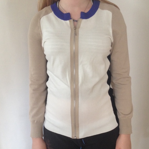 dressy casual. brand new zip up sweater. cream, tan, black and blue colored.