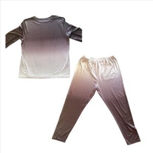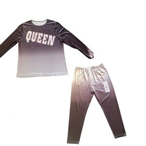 grey-to-white ombré long sleeve matching set with "queen" in bold lettering. fake blood splatter design. soft and breathable fabric. color varies depending on lighting. check all images.