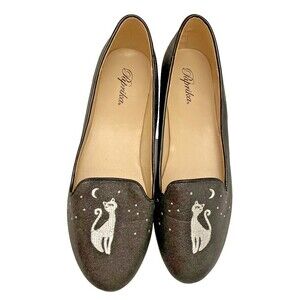 Black Glitter Women's Size 11 Flat Slip On Shoes w/ Cat and Moon Paprika