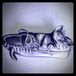 AJC sleeping cat in slipper pin pewter brooch Cat Love ❤️