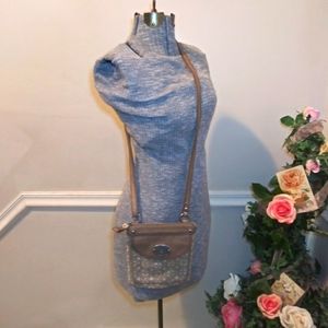 Fossil Leather Trimmed Taupe & Ivory Metallic Brocade Convertible Crossbody