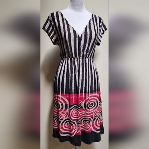 H&M Red V-Neck Midi Dress Short Sleeve Casual Size 8 Geometric Pattern
