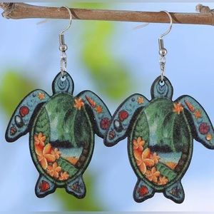🐢 Hawaiian Tropical Print Sea Turtle Wood Earrings Beachy Gift NEW