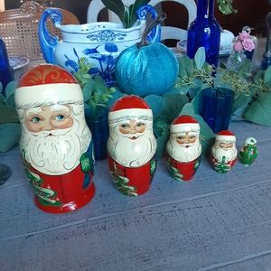 Nesting Santas & Tree, Signed & Holiday Message in what we guess to be Cyrillic.