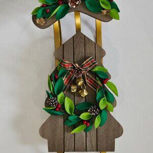 Trees Shaped Wood Christmas Sled With Holly And Berry Wreath And Bells