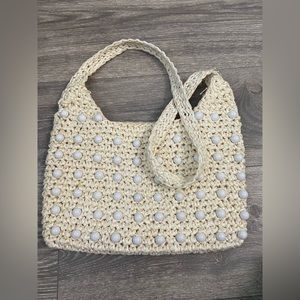 Stylish Tan Woven Bag with Beaded Handle