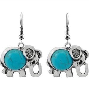 Silver Lucky Elephant and Blue Turquoise Beaded Boho Dangling Drop Hook Earrings