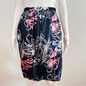 -Tulip skirt silhouette with gathered fabric twist at bottom.