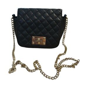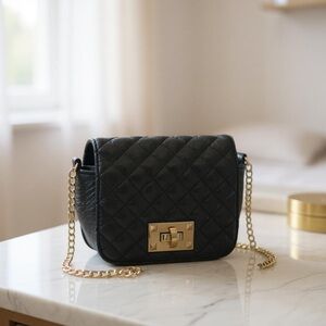 This stylish black quilted bag features a chic gold chain, perfect for any occasion. Its elegant design adds a touch of sophistication to your outfit.