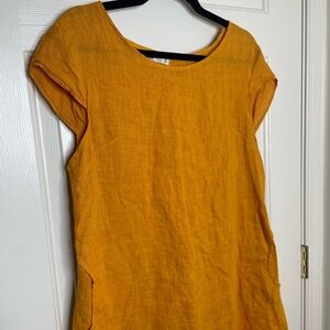 100% LINO Mustard Yellow Short Sleeve linen embroidered Dress with pockets | L