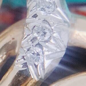 Materials: 14k solid yellow gold (acid tested); likely white gold or rhodium plating; diamond melee (Presidium tested)