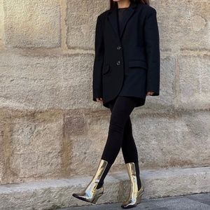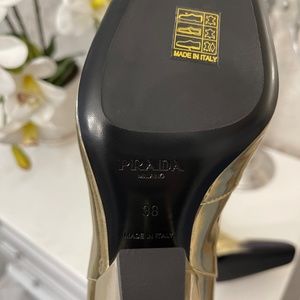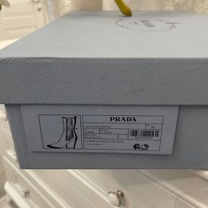 The boots are brand new and come with the box. The leather lining, outsole, and upper material ensure durability and a luxurious feel. The shoes are authentic Prada and come in a US size 8, EU size 38. These boots are perfect for adding a touch of glam to any outfit, and their unique metal theme is sure to make heads turn.