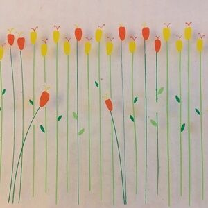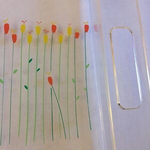 50s tray with cut-out handles in the style of Dorothy Thorpe. Measures 15.75 x 10x 1.25" high. In great condition for its age. Charming colorful florals and stems appear to be either painted or printed onto the underside. Integrated 4 small lifts within the acrylic to lift it slightly up- these are part of the lucite, not separate after market. Super charming and perfect for the Mid-Century Modern kitchen or shabby chic look.