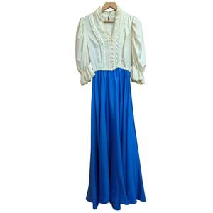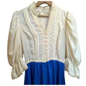 This vintage-inspired prairie dress captures timeless romance with a touch of fantasy. The fitted cream bodice features delicate fabric-covered buttons, lace trim, and voluminous puff sleeves gathered at the elbow. A vibrant cobalt blue maxi skirt flows from the waist, creating a dramatic, sweeping silhouette perfect for strolls through the countryside or dreamy editorial photoshoots. Whether you're dressing for a cottagecore aesthetic, a period-inspired costume, or simply love timeless femininity, this gown is a rare and striking piece. Best fits a moderm size XS. Good vintage condition, elastic in the wrist cuffs has worn out.