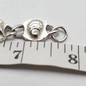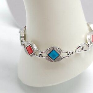This Sarah Coventry bracelet from 1967 exemplifies timeless elegance with its reversible design, featuring intricate sea life motifs on one side and vibrant geometric shapes on the other. Its silver tone adds a touch of sophistication to any ensemble, making it a versatile accessory for various occasions.