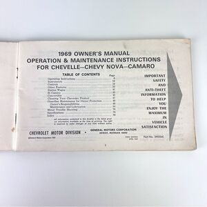 Up for sale we have a 1969 Chevrolet Camaro Chevelle Nova Owner's Manual Third Edition It has some bends, edge and general wear as seen in photos. Please see pictures and email me with any questions.