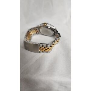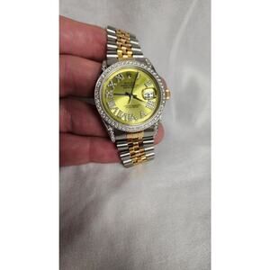 THIS IS A GREAT WATCH IN GOOD CONDITION FOR ITS AGE. NO SCRATCHES ON THE CRYSTAL. SOME LIGHT SCRATCHES ARE PRESENT ON THE BAND. WILL FIT A 7'' WRIST. IT HAS AN AFTERMARKET ROMAN NUMERAL GREEN DIAL. IT HAS AN AFTERMARKET DIAMOND BEZEL WITH AFTERMARKET DIAMONDS AS WELL ADDED TO THE SIDES OF THE CASE AND DOWN THE LUGS. PLEASE CHECK PICTURE FOR BAND WEAR. NO EXTRA LINKS. COMES IN AN AFTERMARKET BOX.
