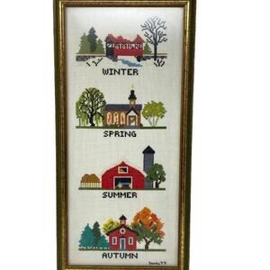 1977 Four Seasons Cross-Stitch Church Barn Trees Professional Framed