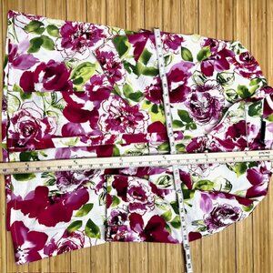1) Maggie Barnes in size 16W pit to pit 24:, lenghten 30", plyester & spandex fabric pink white green floral 3/4 long sleeve featuring a collared neckline and button closure.