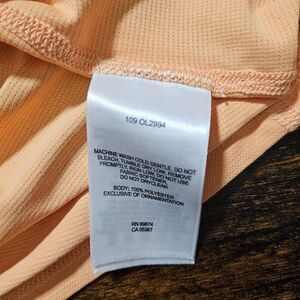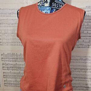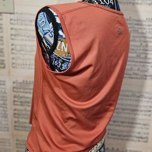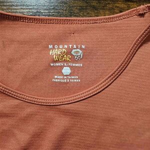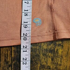 Bundle of 2 tops from workout outdoor gear company Mountain Hardwear. Short sleeve shirt is a light orangey coral, sleeveless tank is light rust orange, both size medium. Pit to pit on both is 17"