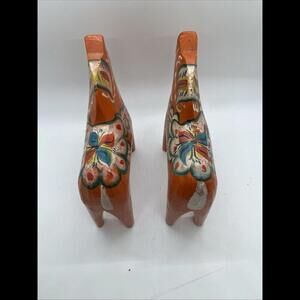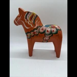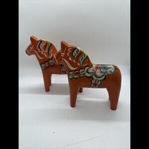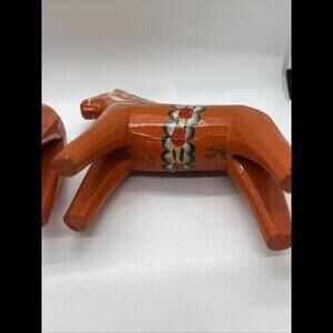 Two Olsson Dala Horse hand-carved and painted in wood from Sweden. Each horse is 6 inches tall and features traditional Swedish craftsmanship. These handmade pieces are intricately designed with no labels attached, adding to their authentic charm and character.