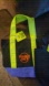 Set of 4 reusable tote bags from Trader Joe's. Includes black, orange, and purple bags with green handles.