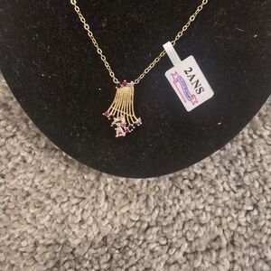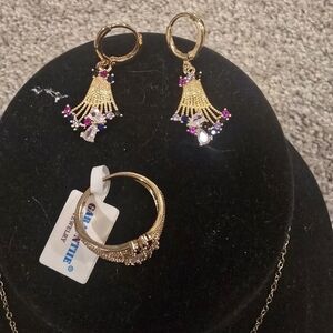 This stunning 21kgp Dubai jewelry set features a gold necklace, earrings, and ring with pink accents. Perfect for adding a touch of elegance to any outfit.