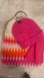 Stylish pink beanie and scarf set fingerless gloves. vibrant orange l, pink and white patterns. Perfect for adding a pop of color to your winter wardrobe.