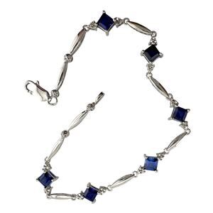 Beautiful bracelet with 6 Lab created blue sapphires (3.10 carats total carat weight) diamond shape in sterling silver bracelet. Small natural diamond accent for a little extra shine. 925 sterling silver.