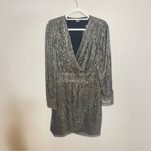 • Metallic Plisse Mini Dress in silver with surplice neckline and button cuffs