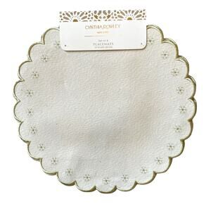 Add elegant holiday charm to your table with this 4pc Cynthia Rowley Snowflake Placemat Set. Made in India from cotton, metallic, and polyester, these 15-inch round placemats feature a stunning cream and gold snowflake design with a scalloped edge for a festive, sophisticated touch. Perfect for Christmas dinners or winter gatherings, they’re machine washable, brand new, and beautifully crafted — the perfect blend of style and holiday sparkle!