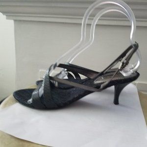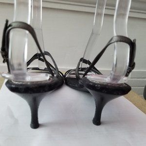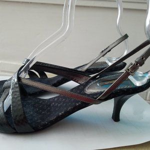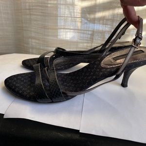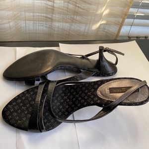 LOUIS VUITTON BLACK LEATHER ANKLE STRAP SANDALS HEELS 37-7 HEELS LV MONOGRAM