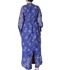 60s 70s Babydoll Dark Blue Floral Maxi Hostess Dress Long Sheer Sleeves Sz 6