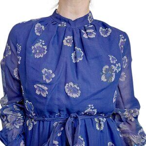 60s Babydoll Dark Blue Floral Maxi Hostess Dress Long Sheer Sleeves Belted Sz 6