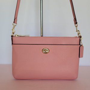 BRAND NEW WITH TAGS. GD/Candy Pink color. A sleek and sophisticated crossbody with enough room to carry your essentials. Crafted of Polished pebbled leather. Features a back zip pocket and a front slip pocket with Coach Iconic Turnlock closure for added storage and easy access. Bag converts from crossbody to clutch by removing the strap.