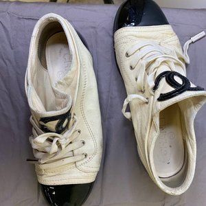 Chanel Black & White 15s G25313 Lace Up Lambskin Patent Calfskin EU Size 36.5