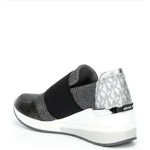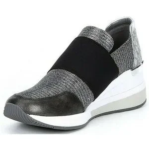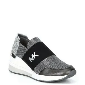 Michael Kors Felix trainers is a combo of bold, mixed-media design blends mesh, brandmark MK logo ramp and leather in slip-on fashion topping off a sporty platform wedge heel.