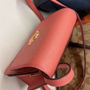 Coach Mini Brynn Crossbody Gold / Taffy Color: Gold / Taffy Crossgrain leather Two credit card slots Inside zip pocket Pushlock closure, fabric lining Outside open pocket Detachable strap with 21 1/2" drop for shoulder or crossbody wear 7 1/4" (L) x 5 1/4" (H) x 2 3/4" (W) Style No. C5626