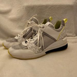 White leather uppers with silver mesh . Michael Kors Logo. Lace up. slight wear to Silver logo on back heel and scuff on inside toe.. see photos. size women 9.5. Good condition.