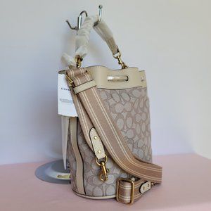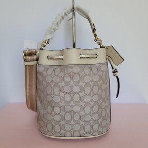 BRAND NEW WITH TAGS. Stone Ivory color. A classic field bucket bag for easy, everyday organization to carry your essentials with an open-top with drawstring closure and a top handle that easily converts to a shoulder or crossbody wear with the included sporty webbing long strap. Crafted of lightweight Signature jacquard and soft glovetanned leather trim. Features: • Signature jacquard and Glovetanned leather • Open Top with drawstring closure. • Solid color fabric lining • Brass/Gold-tone hardware • 1 logo hangtag • Interior: 1 zip pocket • Detachable Top handle 5.75” drop • Detachable/Adjustable sporty striped webbing wide strap with 24.5” drop for shoulder or crossbody wear • Protective feet at base • Small Size bag Approx. 8.75" W x 9.75" H x 5.5" D (width is measured across the bottom of handbag) • Dust bag & Care card included. Style C3853