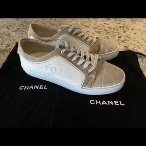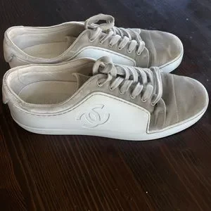 Super cute CHANEL sneakers size 40 which is a 10 in US sizes. Recently gave birth and foot grew so selling many of my designer shoes! These are used but still super cute on and extremely easy to clean! Shoes contain suede material (grey)