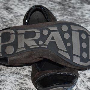 Omg. So freakin' cute amirite? The big ol' "PRADA" screams out on the soles when you sit back and cross your legs. Brown and black, very stylish, they go with pretty much anything.