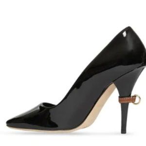 Black Burberry pump, square toe with buccal detail on heel. Gently worn, no scratches on shoe itself, bottoms just slightly used. Comes with original box and dust bag