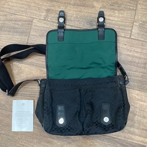 Coach logo fabric, front snaps, adjustable strap, 9 pockets, very gently used, wear seen on bottom edges