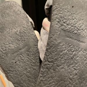 Gray Fabric & White leather Isabel Marant slide sandals with crossover straps at uppers, tonal stitching and black suede covered soles. These have been my "house shoes" for a few years, and they definitely show signs of wear--some rubbing on white leather, some of the soles are worn off, and I spilled some pink paint on them while painting with my kids--got most off but still some remnants! (see photos) However, the quality is so good and they are super comfortable! I'm a 9.5 and they fit me well, could also fit a 10. I find that Isabel Marant shoes/slides run quite small. Non-smoking home/All offers considered.