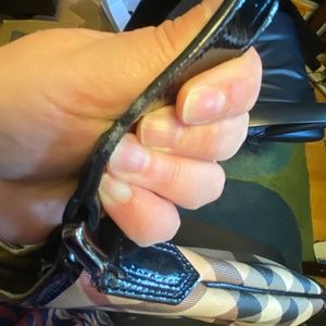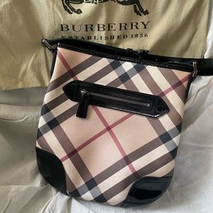 Authentic Burberry Dryden crossbody bag in beige Nova Check coated canvas, featuring contrasting black patent leather accents and finished with gunmetal-tone hardware. VERY gently used, Excellent condition. The outside of the bag is pristine with the exception of a little wear on the strap near the connection to the bag, no stains on outside and patent leather is shiny and fresh looking; the lining has one ink stain on the inside about 3/4" round (see picture). Priced to sell, offers welcomed. This was purchased by me directly from Nordstrom. I loved this bag when I bought it but didn't use it like it deserves to be showcased! Includes original dust bag, which the purse has been stored in.