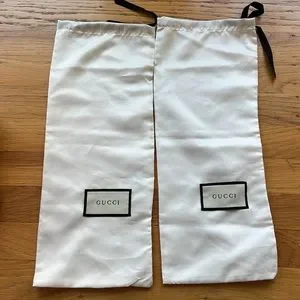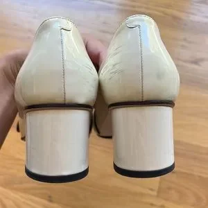White patent leather heels with gucci logo. Some scuffing on heels and on the buckle. Please check photos. The dust bags were never used but do have a mark on each of the back of them